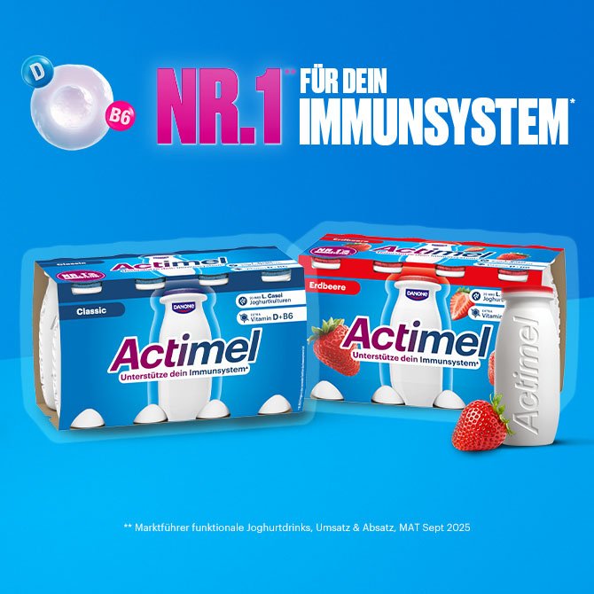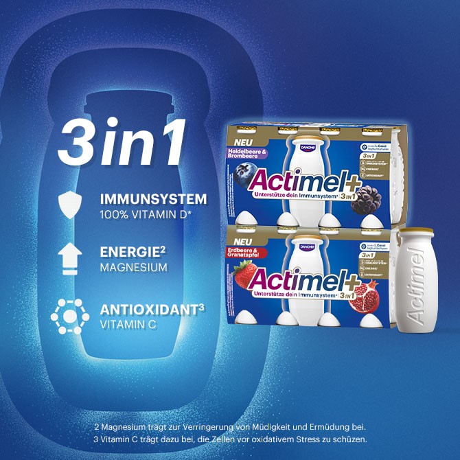 Unsere einzigartigen L.Casei Joghurtkulturen leisten unaufhörlich Widerstand und überleben in großer Anzahl den Weg zum Darm. Zusätzlich ist Actimel mit den Vitaminen B6 und D angereichert, um dein Immunsystem zu unterstützen.*